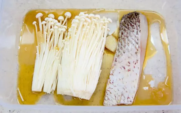 1. 耐熱容器にタラとしょうがとえのき、麺つゆと砂糖を入れる。(ここまでが煮付けの準備)