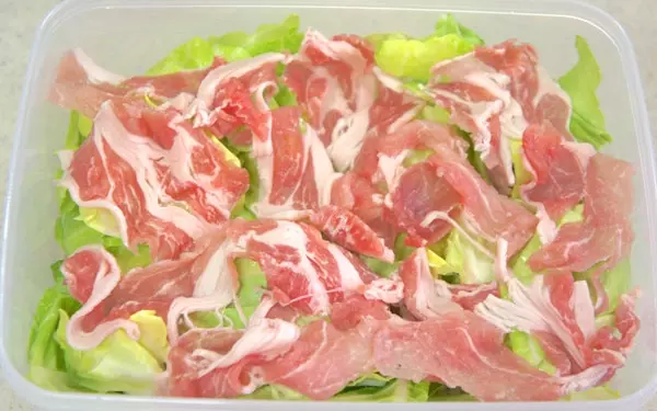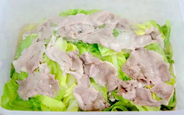 2.キャベツを上から被せ、豚肉を広げてのせる。軽くふたをして600wで6分間レンジにかける