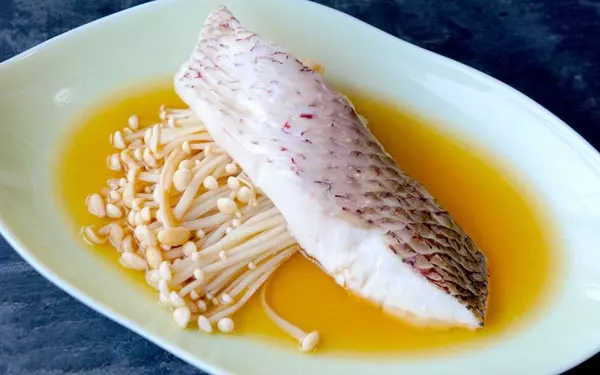 5.魚とえのきを少し深い皿に盛り、汁の味を確認して上からかけて完成!