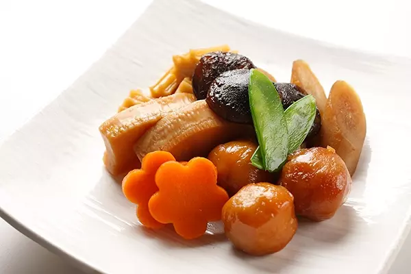 甘煮と書く “うまに” から締めスイーツ豆きんとんまでさて『甘辛の濃ゆい味』の折詰弁当を彩る、江戸の味をいくつか見ていきましょう。まず「野菜の甘煮」ですが、甘煮と書いて “うまに”と読ませる煮物。素材を別々に煮て合わせる煮物ですが、甘くて濃ゆい味にするために普通の煮物に比べると手間も時間も三倍はかかるそうです。