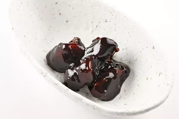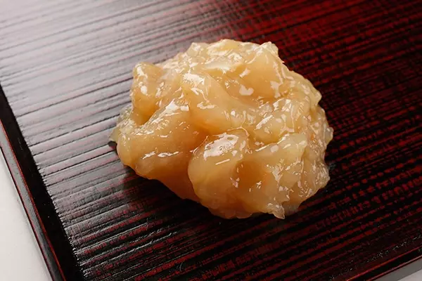 「蛸の桜煮」は、江戸百人一首に『雪と見る笹折詰の弁当は月の玉子や花のさくら煮』と詠まれている、弁松ならではの味。じっくり煮込み桜色になった蛸に吉野葛の餡をからめます。柔らかくて、サクッと噛みきれる蛸。でき上がるまで3日間かかるだけあります。