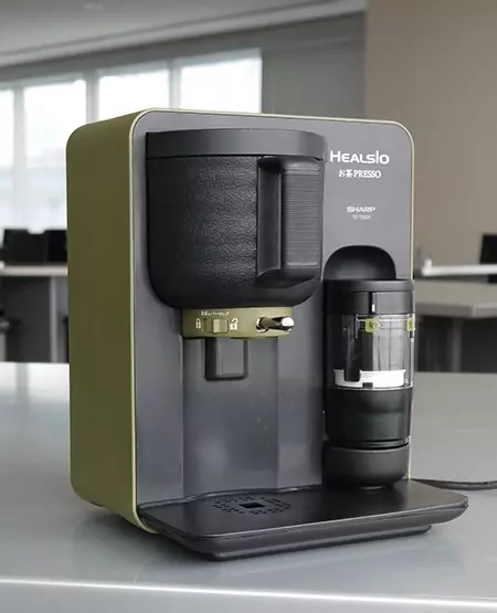 緑茶の栄養素を美味しくいただきます!「ヘルシオお茶プレッソ」続いては、シャープ「ヘルシオお茶プレッソ TE-TS56V」。茶葉を本体右側にある「お茶うす」で挽いて粉末にして、お茶を淹れるマシンです。急須で緑茶を入れると、約3割しか茶葉の栄養成分が摂取できませんが、「お茶プレッソ」を使えば、緑茶の茶葉に含まれるカテキンなどの栄養成分をまるごとお茶にできます。