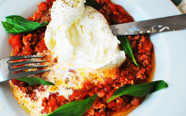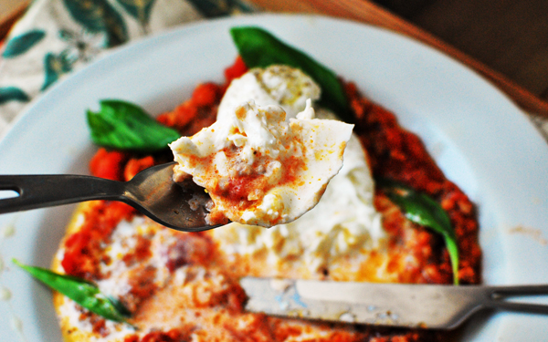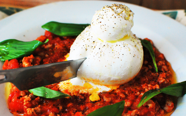 そのクリームが下のミートソースと混ざってソースがまろやか。コク深いチーズとよく合います。大人数の時も、テーブルでこのように演出すれば盛り上がること間違いなし。ブッラータが手に入らないときは、モッツァレラでもOKですが、必ず水牛の美味しいモッツァレラを使いましょう。