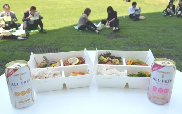 虎ノ門ヒルズカフェでは、サンプリング期間にあわせて「色とりどりの野菜と鶏の唐揚げランチボックス」(500円)と、「色とりどりの野菜と鶏の塩麹炒めランチボックス」(500円)を販売。それぞれ「オールフリー」と、一般発売に先駆けてサンプリングされた「オールフリー コラーゲン」とマッチするランチボックスとなっています。