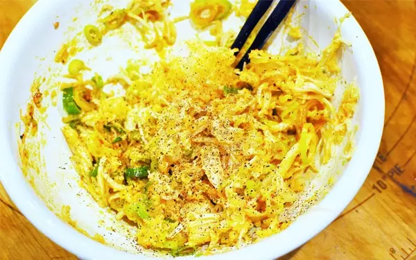 3.ボウルに1の搾った大根と、2のほたての身をほぐしながら入れる。