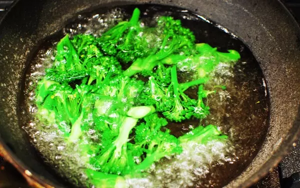 2.スティックセニョールは食べやすい幅に切り、沸騰したお湯で好みの硬さに茹でる。茹でたらざるにあけ、塩を少々ふっておく。