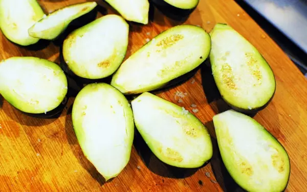 3.小茄子はヘタをとり、縦半分に切っておく。切り口に塩を少々すりこんでおく。