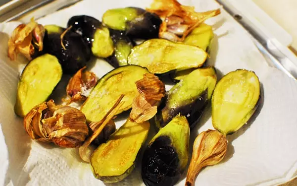 4.中温の油で3を揚げる。一緒に、にんにくも皮付きのまま小房に分けたものを揚げる。揚げたらしっかり油を切っておく。
