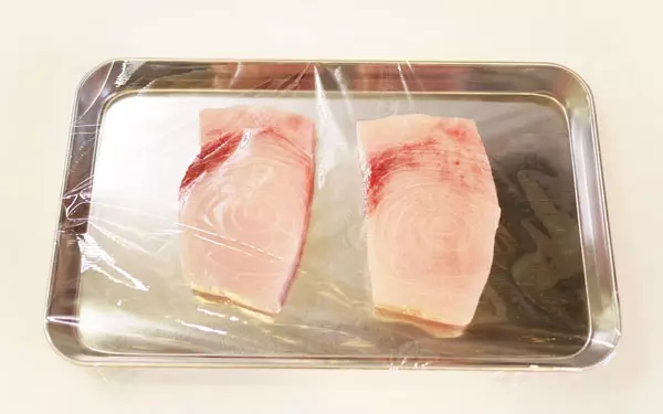 1.まず、調理する分だけカジキを冷蔵庫から出し、ラップをかけておきます。室温や器などにもよりますが、焼くタイミングから逆算して30分~1時間前くらいから出しておくのが理想。調理に時間がかかりそうな場合は、ある程度目処が立ってきてからでOKです。(焼く直前に冷蔵庫から出すと、火が均一に通りにくくなるので注意して下さい。)