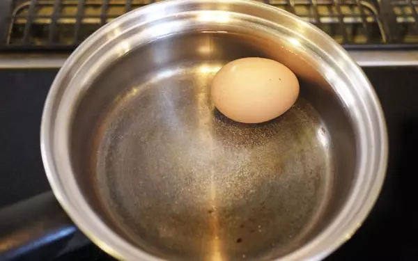 2.次ぎに、ゆで卵を作り始めます。小鍋に水と冷蔵庫から出した卵を入れ、火をつけます。火加減は中火。火にかけた時点から数えて15分加熱し、水でよく冷やします。(途中吹きこぼれそうな場合は、火を少し弱めて下さい。)