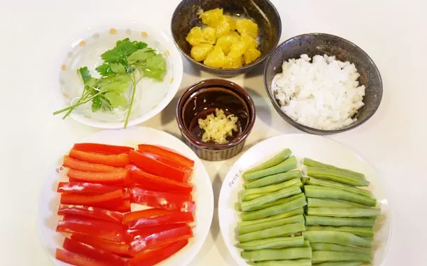 3.卵を茹でている間に野菜の下準備をします。ニンニクと玉葱はみじん切りにして、玉葱には塩を適量(小さじ1杯程度)まぶしておきます。パセリは流水でよく洗い、水に晒しておきます。甘夏は甘皮を取り除き、食べやすい大きさに果肉を裂いたら冷蔵庫へ。インゲンは両側面の溝に沿って筋があるので、先端を少し折り、溝がある方向に引っ張って2本取り除きます。終わったら半分の長さにカット。パプリカはインゲンと同じくらいの長さになるように上下を切って種を取り、同じか少し太いくらいの太さに切り揃えます。全体の厚みが均一になるように、内側の白い部分は包丁で切り取ります。(余ったパプリカは、スープやパスタ等の具に使えます。刻んで冷凍しておくと便利。)