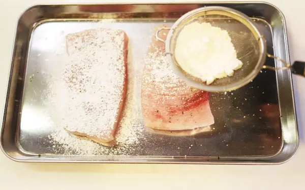 5.カジキから出てきた水分をペーパーで拭き取り、臭みを取り除きます。その後、高い位置から両面に薄く塩胡椒をふり、粉を薄くまぶします。(茶こしを使うと均一に付きやすくなるのでお勧め。)断面も忘れずに粉をまぶすのがポイント。※下味を付けた後は必要以上に水分が出やすくなるため、そのまま放置しないこと。必ず焼く直前に行うようにして下さい。