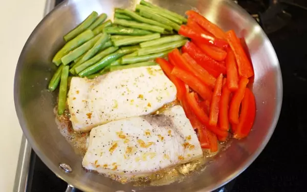 6.弱火のフライパンでバター適量(20g程度)を溶かしてインゲンとパプリカを入れ、塩を少々振ります。中弱火でかるく炒めてから弱火に落とし、端に寄せます。空いたスペースにニンニクを入れて広げ、カジキも入れます。(最終的に見せたい面を下にして、先に焼くのがポイント。)断面を見て3割程色が変わってきたら反して蓋をし、約3分蒸し焼きにします。(焼き色はかなり薄くてOK。新鮮な刺身用以外は、最終的に中心まで火を通します。カジキは火が通りやすく、ニンニクやバターは焦げやすいため、火加減に注意。加熱を始めたら、その場から離れないようにして下さい。)