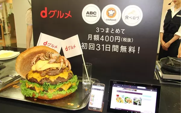ABCクッキングスタジオが開発した「特大dグルメバーガー」の調理デモンストレーションも大盛り上がり。直径30cm以上のバンズに、特大パティ、ステーキ、オムレツ、蟹など高級食材ばかりを使った贅沢なバーガーは、重さ約10kg、カロリーはなんと約24,800kcal! この「特大dグルメバーガー」レシピは、「dグルメ」内で現在公開中。パーティやBBQで作って、みんなを驚かせてみては?