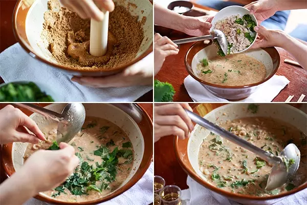すり鉢でごまを5分ほど擦り油が出てきたら、麦味噌を加えてさらによく混ぜます。昆布だしを少しずつ加えて溶き混ぜた後、塩揉みしたキュウリ、焼いてほぐしたアジの干物、輪切りにしたミョウガ、みじん切りにしたネギを加え、最後に香りを立たせるために大葉を手でちぎって加えます。