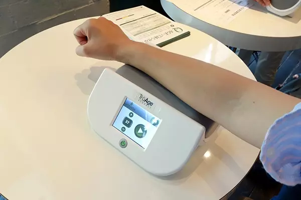 AGEスキャナーでAGE測定。皮膚に光をあてることによる蛍光値によってAGEを計測。1分程度で計測できる