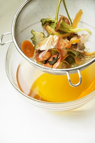 4)ボウルの上にザルをおき、鍋ごと移して濾す。野菜の旨味と栄養が凝縮された黄金色のベジブロスが完成。