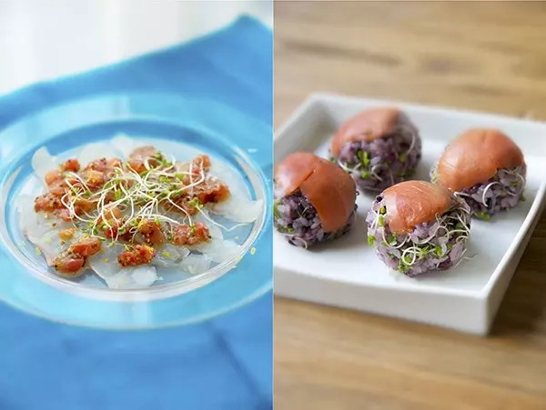 掲載メニューの一例。(左)鯛のカルパッチョ、(右)サーモンの手まり寿司。生の魚を使う料理はアンチAGEメニューの強い味方