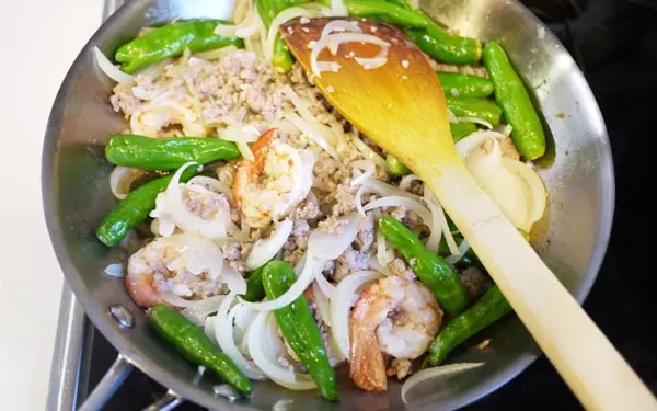 5.海老、獅子唐、玉葱を加えてさっと炒めます。海老に7割程火が通ったら、ナンプラーとオイスターソースを加えて炒め、火を止めます。海老は加熱しすぎると固くなるため、火が通ったら取り出しておきます。