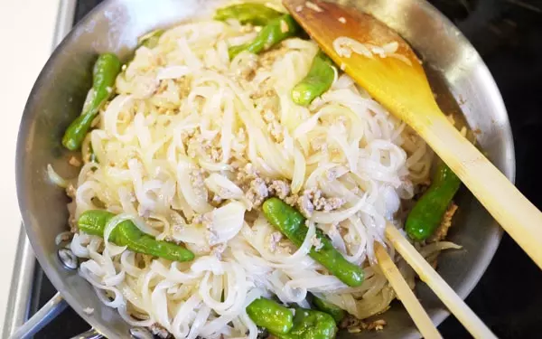 6.お湯が沸騰したら麺を入れ、混ぜながら短時間茹でます。ザルに上げて水気をかるくきり、フライパンへ。全体的によく混ぜながら炒めて完成。もしも味が薄い場合はナンプラーを、麺がくっつく場合は胡麻油を少量足してください。