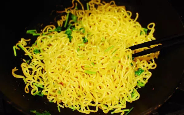 4.別のフライパンに焼きそば麺を入れ、中火にかけて水を大さじ1ほどいれてほぐす。塩で少々味をつけたら、パクチーを入れよく混ぜ合わせる。