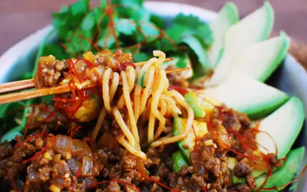 ピリリと辛いキーマカレーが絡んだ麺。みんな大好きなこと間違いなし!