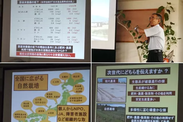 「農薬や化学肥料に頼って作る現代の作物は、栄養価も下がっているのです。科学技術庁の『日本食品標準成分表』でもそれは明らかです。たとえば1951年と2000年で比較すると、ほうれん草のビタミンAは8,000IUだったのが、約50年後には700IU、1/10以下に。ミカンのビタミンCは、2,000IUから33IUに。