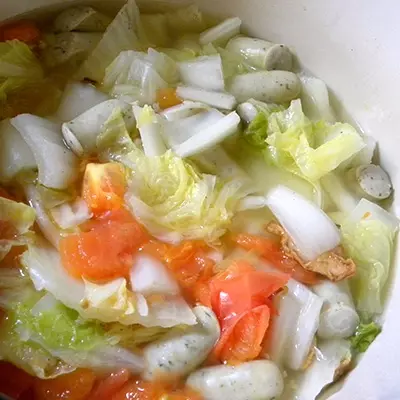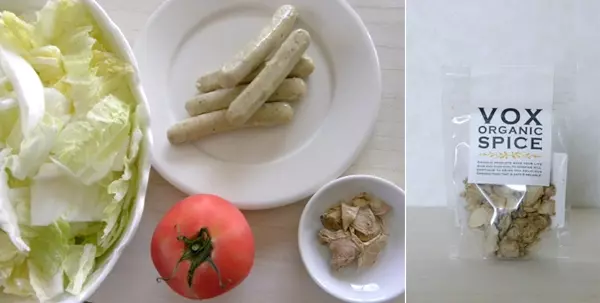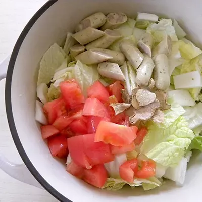 1)白菜、トマト、ハーブソーセージを一口大に切り、ジンジャーチップと共に鍋に入れ、中火で10~15分程度火にかけます。