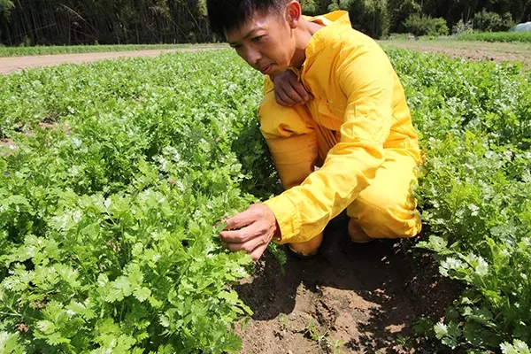 黄ニラ農家の植田輝義さんは15年前からパクチーを生産。