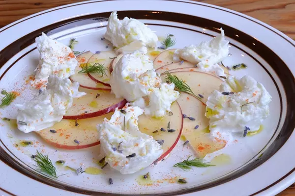 モッツアレラチーズのミルク感がいろいろな味を中和します。りんごを薄く切ることでチーズと一緒に口に入れたときに程よく混ざり合います。ラベンダーはハーブティとして販売されている乾燥したものを使ってください。