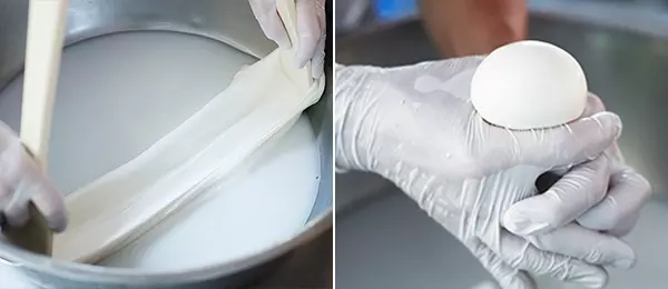低温殺菌した生乳に乳酸菌とレンネットを加え、40度で6~7時間、カードを熱湯につけて引っ張るように練って丸める。