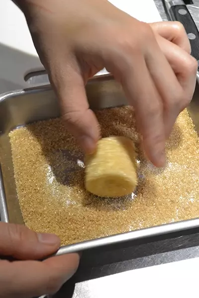 1)バナナは長さ3cmに切り、三温糖をまぶし、金串に刺す。
