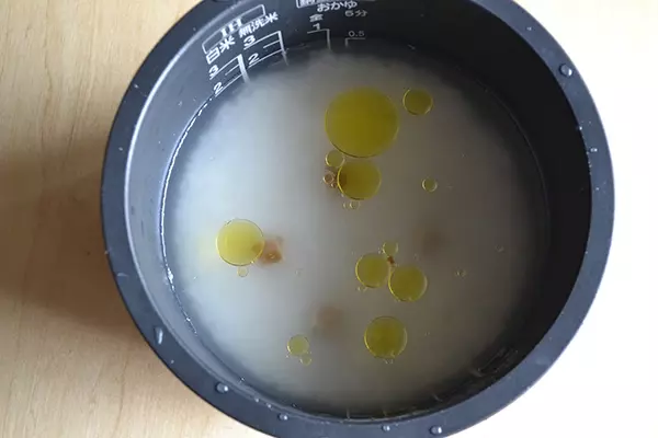 2)炊飯器の内釜に入れ、2合分の水と固形スープの素を4等分にして入れ、オリーブ油を加える。