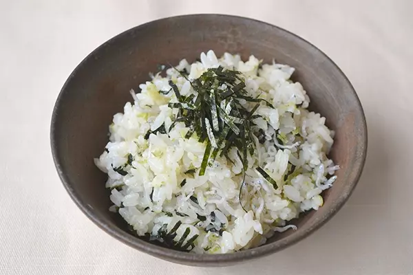 3)炊飯し、炊き上がったらしょうゆを回し入れ、すりおろしたわさびと刻み海苔を加え、しゃもじで切るように手早く混ぜる。