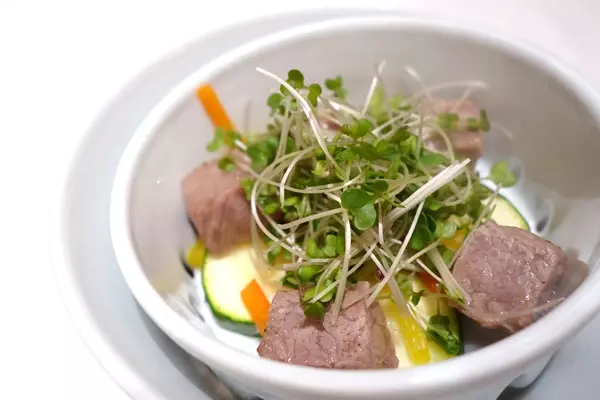 1)1人用蒸し器にパプリカ(赤・黄)・ズッキーニの薄切りを並べ、その上に塩・胡椒した黒毛和牛ロース肉を盛り付け、ほどよく蒸し上げる。