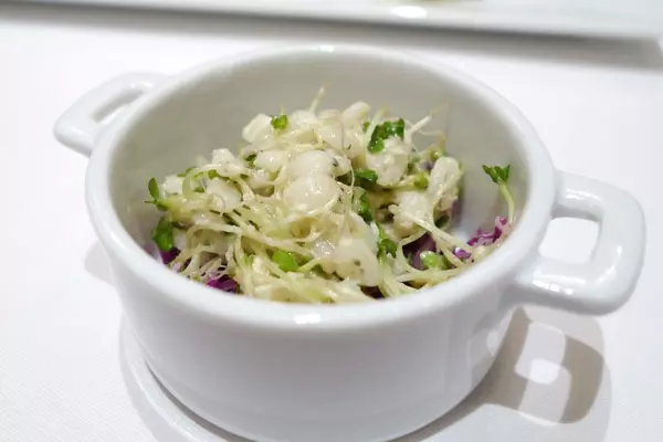 3) 千切りしたレッドキャベツに(2)をのせる。