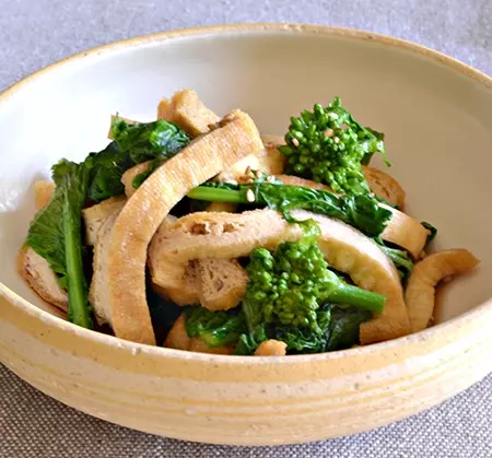 菜の花に含まれるビタミンCは、大豆製品に含まれる鉄の吸収を助けるという女性にうれしい栄養メリットもあります。菜の花がなければ小松菜でもOKです!