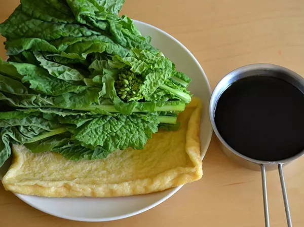 1) 油揚げは熱湯をかけて油抜きし、幅7mmに切る。菜の花は長さ3~4cmに切る。