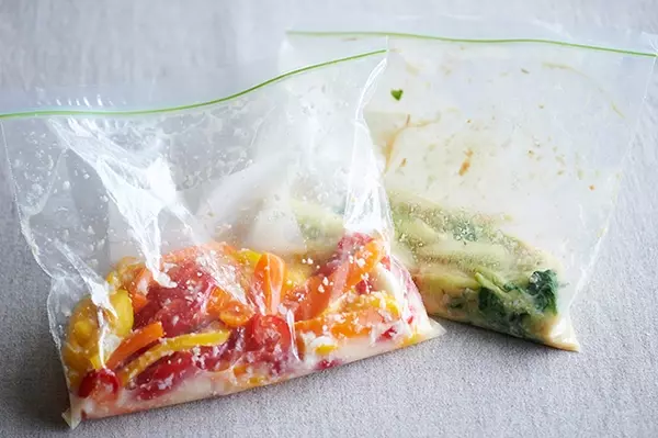 1)パプリカはニンニク1かけを包丁の腹でつぶしたものとともに保存袋に入れる。