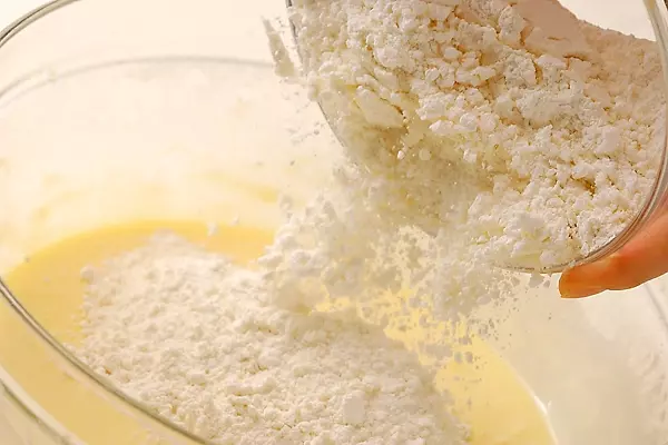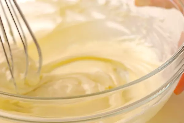 2、卵と合わせたオレンジジュース、バニラエッセンスを加える。なめらかに混ざれば、ホットケーキミックスとレーズンを加え混ぜる。