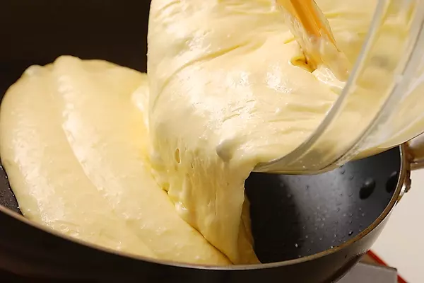 3、フライパンにサラダ油をひき、中火にかける。フライパンが温まれば一気に2の生地を流し入れ、弱火にしてフライパンに蓋をする。
