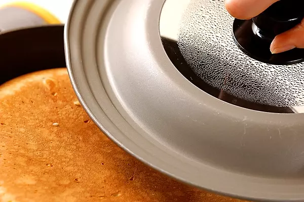 4、フライパンに接している面がキツネ色になったら(約12~13分)、ひっくり返す。同様に蓋をして、弱火で5~6分焼く。食べやすい大きさに切り分け、粉砂糖を振り、ミントの葉を添える。