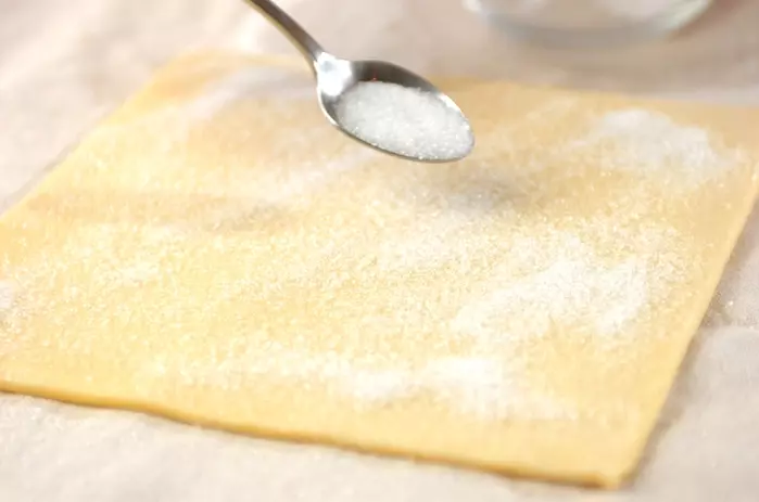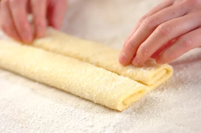 グラニュー糖をたっぷりまぶして裏返し、同じようにグラニュー糖をまぶす。グラニュー糖がとれないように麺棒で軽く押す。