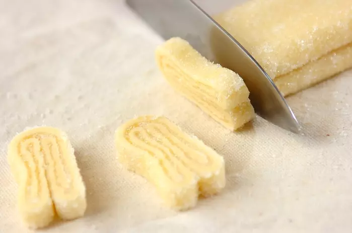 3、端を切り落とし、幅1cmにカットする。冷凍庫で10分ほど休め、1個ずづ天板にのせて先端を少し開く。