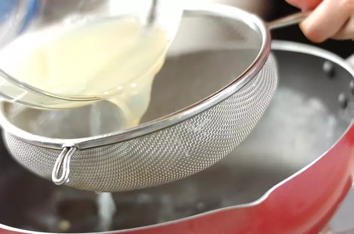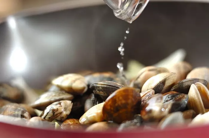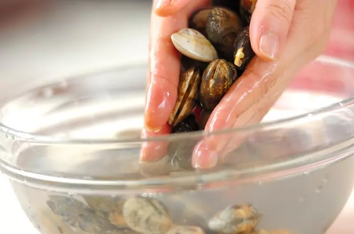 ・アサリは殻と殻をこすりあわせるように水洗いし、ザルに上げておく。