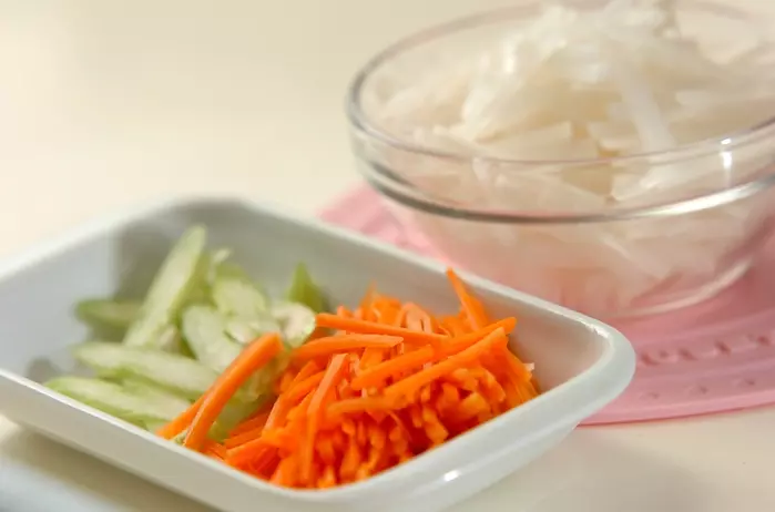 ・大根、ニンジンは皮をむいて細切りにする。セロリは筋を引いて斜め薄切りにする。大根、ニンジン、セロリは分量外の塩をもみ込んで10分置く。