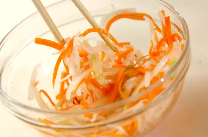 1、<調味料>の材料が入ったボウルに、水気をしっかり絞った大根、ニンジン、セロリを加えて和える。10分置く。