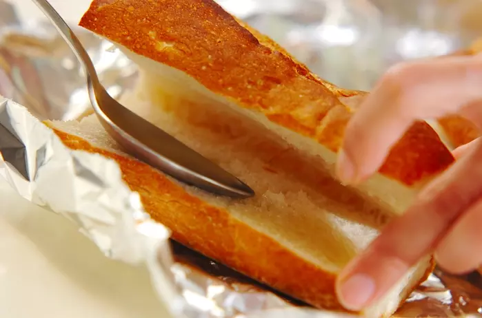 2、バゲットは端を切り落として、長さを半分に切る。厚さ半分の切り込みを入れて、トースターで軽く焼く。ピーナッツオイルを薄くぬる。