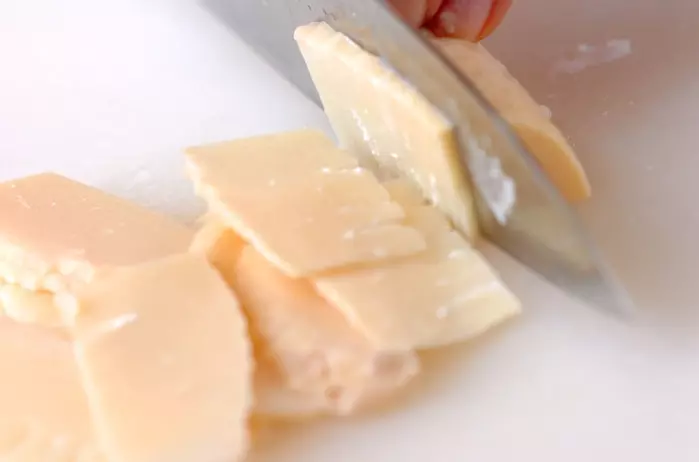 ・水煮タケノコは、食べやすい大きさの縦薄切りにする。