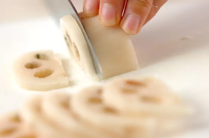1、 ジャガイモ、ニンジン、レンコンは皮をむいて縦半分に切り、厚さ5~6mmの半月切りにして水に放つ。ボウルで<ドレッシング>の材料を混ぜ合わせる。